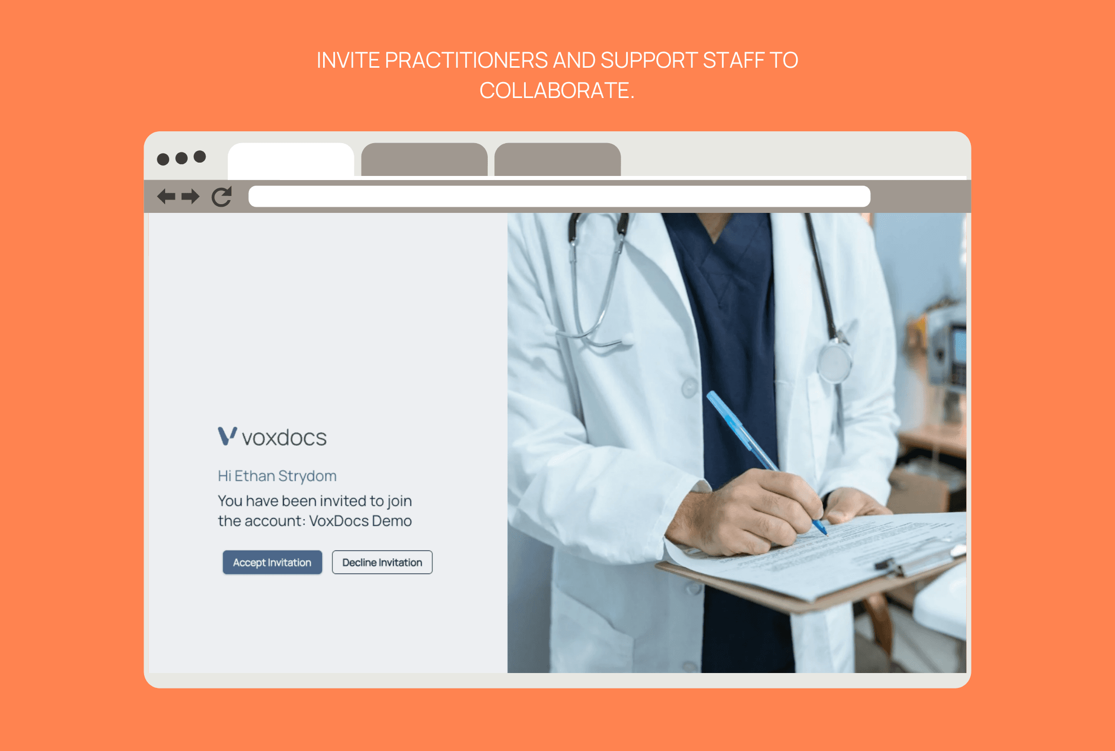 With the Practitioner Pro plan, you can invite your support team and seamlessly send documentation from the VoxDocs app or web portal. Documentation is securely routed through your workflow, with notifications keeping you informed at every step.