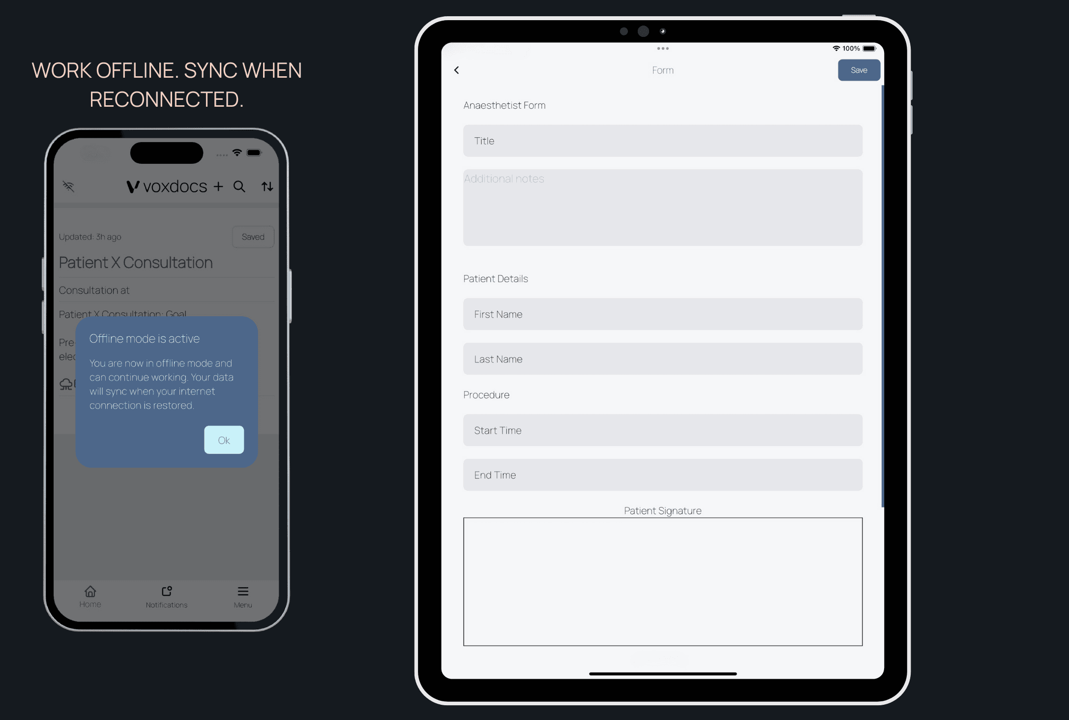 Our VoxDocs app available on iOS and Android devices allows you to use all features even when offline. Any changes you make will automatically sync once your device reconnects to the internet.